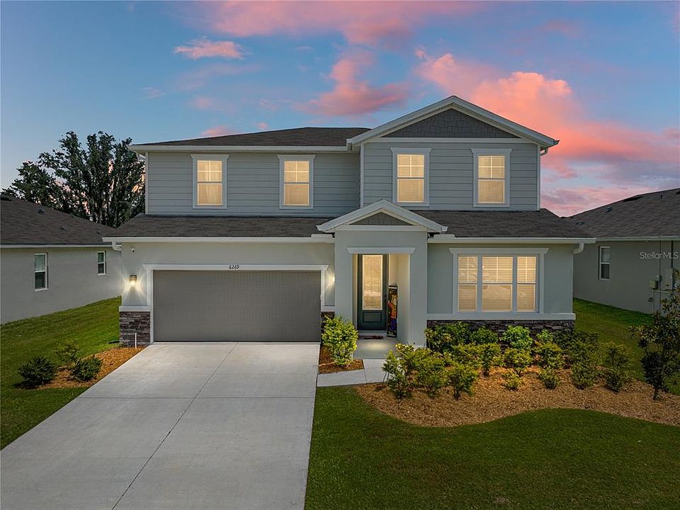 This pristine 5BR/3.5BA home located in Riverstone is practically brand new! Built in 2021 by Richmond American Homes of Florida, the home boasts a unique floor plan and many upgrades such as 5" baseboards throughout. Upon entry, immediately to your right, you find an in-law/multi-generational suite with a separate sitting room and full En Suite. Moving further into the home, you enter the Great Room with the Kitchen and Dinette to the left. The Kitchen showcases 42" cabinets with crown molding, soft close drawers, upgraded hood vent, an island with sink, and matching stainless steel appliances. There is also a convenient "drop area" leading from the Kitchen to the garage for unloading groceries or additional appliances or storage. Quad panel sliders with custom window panels lead outside. Once outside, you see the back concrete patio has been extended, making extra room for entertaining. Ascending the stairs to the upper level, you find an open and bright Loft that can be utilized as a media area, game room, exercise space, etc. To the left off the Loft is the Primary bedroom which features a fabulous En Suite. The En Suite has quite a spacious walk-in closet and includes many upgrades: glass door added to beautifully tiled shower, upgraded dual sinks, and a Viper toilet. To the right of the loft, you find 3 additional bedrooms, a full bathroom, and a laundry room. Of note, there is a water line installed out back if the new owners would like to install an outdoor kitchen. There is also a water line in the garage for a future utility sink. There is also a hook-up (only) for a water softener if the new owners would like to install one. This home is stunning and waiting for you to make it your own! Schedule your showing today!