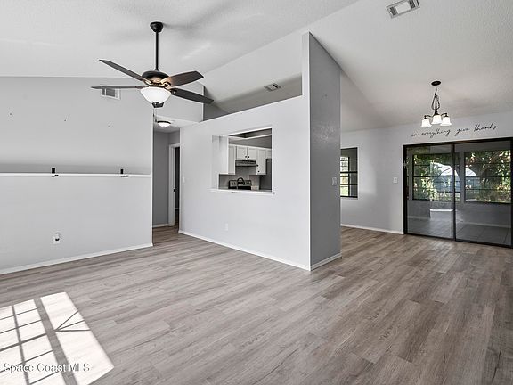 This move-in-ready 3-bedroom, 2-bath Palm Bay home on nearly a quarter-acre is packed with upgrades and charm, and a brand-new roof is set to be added before closing! The kitchen features stainless steel appliances, quartz countertops, and ample storage space, perfect for entertaining or cozy family dinners. Vaulted ceilings in the dining and family rooms enhance the open feel, while vinyl plank flooring throughout makes cleaning a breeze. Step outside to enjoy your mornings or evenings on the inviting enclosed patio, overlooking a spacious, fully fenced backyard. Plumbing supply lines all replaced in 2021. Plus, there's no HOA, and you're just moments from shopping, dining, beaches, and Orlando! This home perfectly blends comfort and convenience at a great price—don't miss out on this opportunity!
