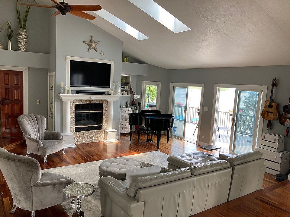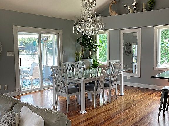 Water view from each main area, vaulted ceiling, screen porch, Brazilian hard wood, newer deck, railing ,roof, water heater, drainage 2-gas fireplaces, infared sauna, heated floor, garden tub, 4th bedroom is wineseller, office, man cave , large Browning Gun safe in secret closet, large walk out patio , electric lift, wave runnner pads, attic storage , 3 car garage , walking distance to park and town.