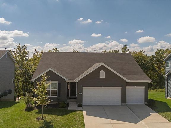 This 4-year-old ranch with a 3-car garage has fresh updates - new paint on the main level & luxury vinyl plank was just added to the great room, hall & kitchen – providing a blank slate to enhance w/your own personal style! Almost 2000 sq ft on the main level, the split-bedroom floorplan is a most requested item. The heart of the home has an open & airy feel with vaulted ceilings & tons of windows overlooking the nature of the common ground! A large ensuite has a spacious walk-in, bath with tub & shower, separate raised vanities & a water closet. PLUS another 530 square ft was finished by the builder at time of construction in the walk-out basement to include a giant family/rec room & a full bath. Washer, Dryer & Frig stay! This home backs to common ground that is designated as a nature preserve PLUS the Trailhead of Deer Ridge Park is a short walk up the street - enjoy the 2.5 miles of hiking trails around creeks & nature, park is maintained by Lake St Louis.