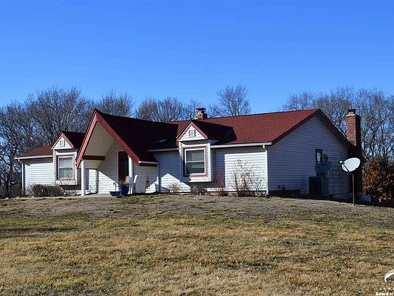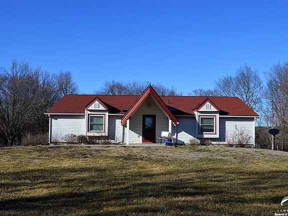 Just 13 minutes from S Lawrence, on over 4 acres in a quiet dead-end area, this splendid setting offers fantastic privacy and such usable space! Perfect area to build a shop and enjoy the established garden plot and fruit trees. One of a kind, must see open floor plan featuring two real rock, two-story fireplaces; one with a wood stove, the other wood-burning with a blower. The interior is ready for your own style and colors with new fresh updates! Seller prefers as-is. Easy to show-Schedule today!