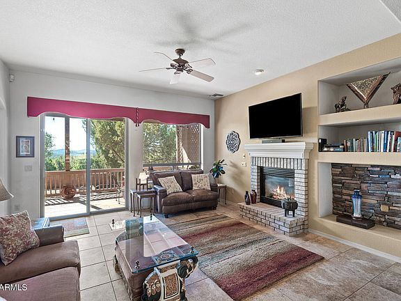Welcome to your dream home nestled in the prestigious Rim View Estates! This exquisite property offers unparalleled privacy with undeveloped land as your backdrop and breathtaking views of the majestic mountains. Step inside and be greeted by an abundance of natural light streaming through large windows, illuminating the spacious living areas. The charm of chair molding in the dining room adds an elegant touch to your entertaining space, while a cozy brick fireplace invites you to unwind and relax. The heart of the home boasts laminate flooring in the kitchen, complemented by matching white appliances and built-ins in the living room, providing both functionality and style. Recently updated with new carpet and tile in January 2024, this home exudes modern comfort. Outside, discover your oasis with a charming stone patio and walkway, perfect for al fresco dining or enjoying the serene desert landscape. A covered patio offers shade and relaxation, while a small shed provides additional storage space for your outdoor essentials. Notable upgrades include a sliding double-paned glass door installed in May 2020, ensuring energy efficiency and enhancing the seamless indoor-outdoor flow. The exterior of the house was tastefully painted in 2017, while a flagstone deck and sidewalks were expertly crafted in August 2015, adding to the home's curb appeal and durability.