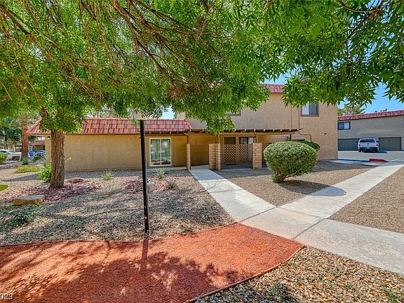Adorable Henderson Townhouse with 1 bedroom, 1 1/2 bath, 1 car garage with gated wrought iron covered courtyard. House features wood floors down and carpet upstairs. Kitchen with breakfast bar, granite counters, brick wall, white appliances to include new electric stove, small dining nook with slider to courtyard. Living room with ceiling fan & light open to kitchen area. Bedroom and loft are combined into one big area. Primary bath with new sink vanity and new toilet, garden tub & shower combo with linen closet. Guest bath with pedestal & new toilet. Laundry with stackable electric washer & dryer. Community features community pool & spa, clubhouse, tennis courts, guest parking, separate RV parking.