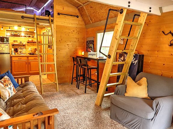 Experience tranquility in this fully renovated, 312 SF mini cabin on an unrestricted 0.57-acre lot. Thoughtfully furnished with a covered porch, it features a studio apartment layout, full bathroom, and kitchen. Modern amenities include electric, public water, septic, High-Speed Fiber Optic Internet, and a Central Mini-Split unit. Two loft sleeping areas or storage provide flexibility. The property includes an 8x10 storage building, 200 Amp Main Service, and a 50-AMP RV Plug and Hookup. Currently an Airbnb with stellar 5-star reviews, this cabin offers income potential. Just 1.6 miles from Barkley Lake's boat launch and a short drive to conveniences, it's an idyllic nature retreat. Your perfect escape awaits!