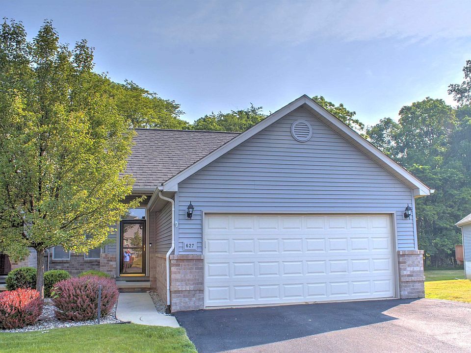 Get ready to relax on the private back deck and enjoy the Evans Creek while someone else mows the yard! Welcome Home to 627 Ridge Lane in Buttermilk Park, located on the east end away from the construction! This 2 bedroom, 2 bath condo features an open floor plan with vaulted ceilings, first floor laundry, attached garage and an unfinished basement with egress windows and plumbed for a 3rd full bath. Large kitchen offers pantry, new stainless appliances, and an abundance of counter space. This one owner home has been well cared for and maintained. It offers a slider to the deck from the master or access it from the door off the living room.