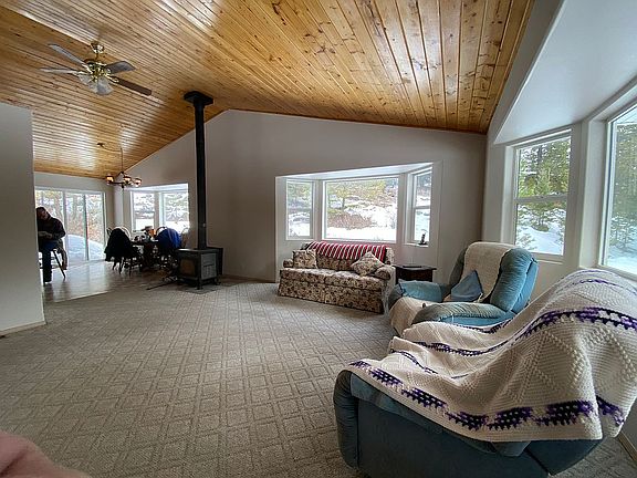 Custom built home with vinyl siding, metal roof and covered wrap-a-round deck. Interior features: 2 full bathrooms, cedar TG vaulted ceilings, large dine in kitchen with gas (propane) new 2021 appliances and breakfast nook. Serviced with: Propane heat, wood stove, AC, private well and septic system. Oversized one car garage attached. Separate shop 60x60, RV bay, partial loft storage. 20 acres with trees.