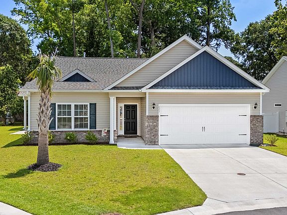 Beautiful Seascape floor plan in the Ocean Palms community, on a rare cul-de-sac lot with plenty of room for a hot tub - with wiring already in place. This home has a terrific open floor plan and upgraded wood-look LVP flooring throughout the entire home - no carpet. The home has stainless appliances, staggered-height Shaker-style white cabinetry, quartz countertops, a large corner pantry and a beautiful apron sink in the kitchen. The bay windows in the dining area, double French door and triple windows in the great room flood the room with ample natural light. French doors from the dining room lead to a large covered porch and a concrete patio, with the yard beyond. The spacious owner's retreat features a tray ceiling, walk-in shower, long quartz vanity with double sinks, plenty of storage in the cabinetry and linen closet, plus a huge walk-in closet. Two additional bedrooms and a bath tucked off on their own private hallway, for privacy. The spacious laundry room with another large closet. The home has the luxury of natural gas, tankless water heater, gas heat, and gas range. The 2 car garage is completely trimmed and painted, with attic space accessed by drop-down stairs, a garage door opener with wifi capability and an added mop sink. Ocean Palms is conveniently located near shopping, restaurants, schools and medical offices and hospitals, plus it's only a short golf cart ride to Surfside Beach's gorgeous beach and the Atlantic Ocean- or relax by the pool and cabana!