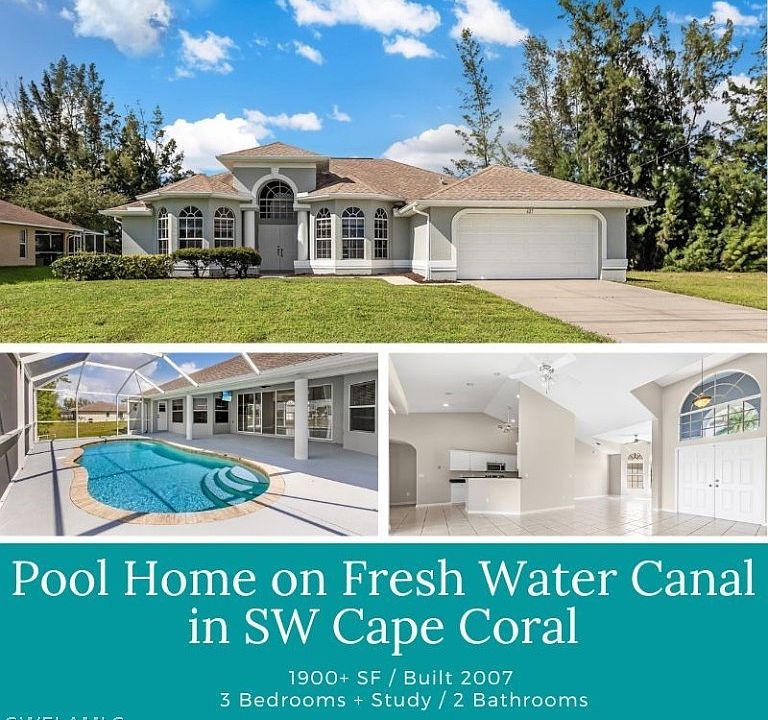 Perfect move-in ready home or great investment opportunity!!! Just painted inside and out. Spacious 3/2 pool home on Freshwater canal in SW Cape Coral. Look no further and call today to schedule a showing! Located in the heart of Cape Coral (corner of Veterans Pkwy and Skyline Blvd), this 1900+ SF home is close to restaurants, shopping and schools. You will love the large screened-in pool area with view of the canal. The home features, stainless steel appliances, spacious living area with study, breakfast-nook and breakfast bar, a large main bedroom with big walk-in closets and a bright and roomy bathroom with double sinks and a large shower as well as separate toilet. The two guest bedrooms share another bathroom with tub.