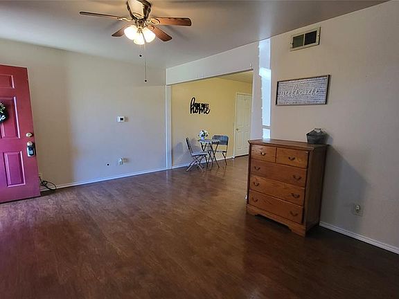 New Price and just in time to celebrate the New Year in your own home! Welcome to this charming home located in the heart of Moore and in Southmoore High School District with easy access to I-35. This super cute & efficient floorplan includes 1175 sf (mol) with 3 bedrooms, 1 bathroom, living room, eat-in kitchen/dining PLUS A FLEX ROOM staged as a 4th bedroom but could be used as a 2nd Living Room, Office or Exercise Room! The converted garage contains a combo laundry room/mud room, closet plus the FLEX ROOM that has been utilized (and staged) as a bedroom. HVAC installed Sept 2021, Roof installed in 2013, Wood-Look Laminate Flooring in Living Room, Kitchen & Hall, Tile in the Bathroom, Carpet in the 3 Bedrooms and the FLEX Room. The good sized backyard features a Large Covered Back Porch/Wooden Deck that is a great entertainment space to make memories while enjoying the outdoors! The storage shed is perfect to house your lawn equipment and gardening supplies! Seller is selling in "As-Is" Condition. Reserved Items: Refrigerator, Camera's.