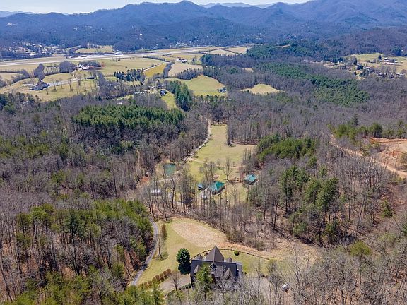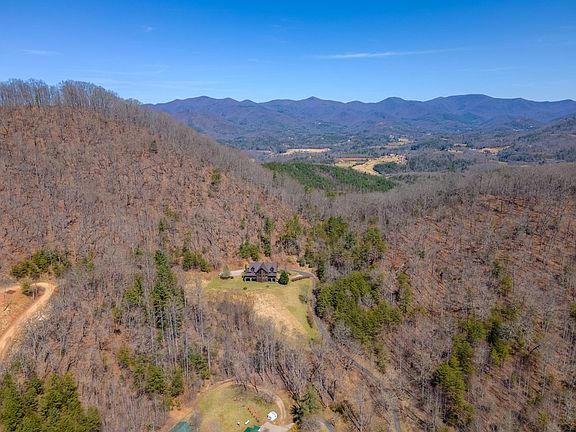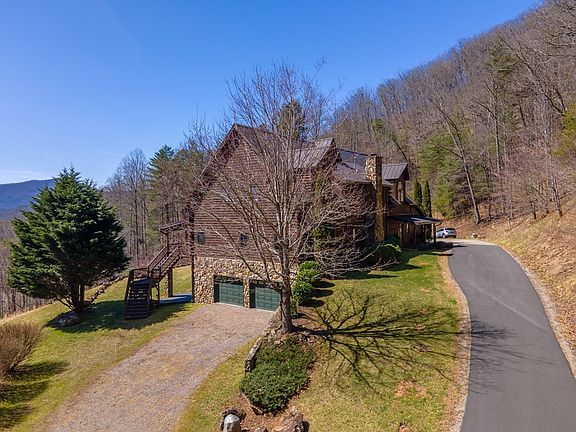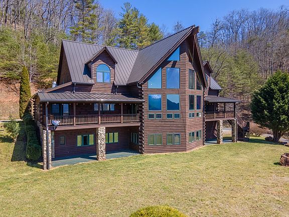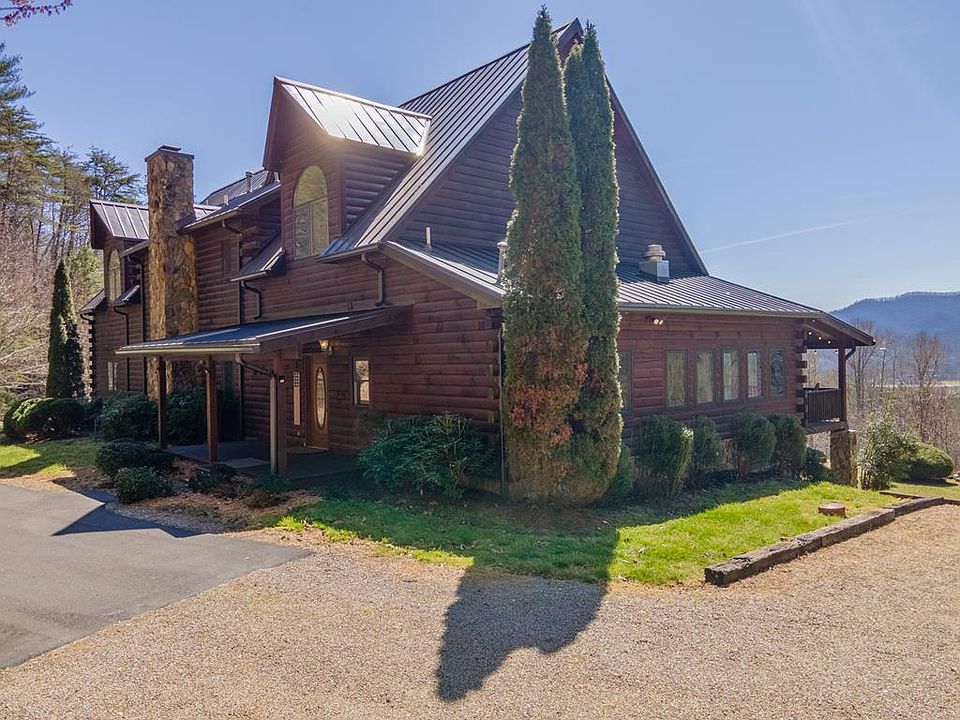 Stunning 5 Bedroom 4 1/2 Bath LOG HOME located on 25 private acres in Iotla valley with GREAT breath-taking VIEWS! This retreat-style home can host multiple families at a time! You have approx 6800 Sq Ft finished/heated and approx 1800 Sq Ft of decks! Level yard plus VIEW is a rare find. Inside this lovely custom log home you'll find a chef's kitchen with oversized pantry and LOTS of countertop space - spacious breakfast nooks that open to decking - additional dining area next to the grand living room on the main level with a wall of windows to let the view in PLUS 30+ ft vaulted T&G ceilings. Master is located on the main level with large en-suite bath & walk-in closet. Other features you'll find are: natural rock fireplace + gas, 2 heat pumps, 2 laundry rooms, security system, wired for generator, 3 gas hot water heaters, 2 Car Garage, Solid Cherry cabinets, standing seam metal roof 2020, GE Monogram SS appliances. The lower level features walk-out patios and is currently set up as the ultimate entertainment family den! Home can be sold furnished too! Come sit on the porch and listen to the local church bells ring, the setting is pretty special! Work from home with these views!