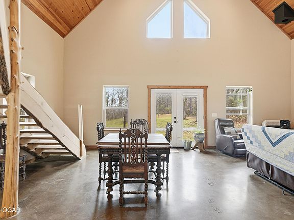 Tucked away at the end of a quiet drive, this charming home sits on 17 ± secluded acres, offering the perfect blend of privacy, comfort, and rustic elegance. A covered wrap-around porch with stamped concrete sets the tone—welcoming you to slow down, sit awhile, and take in the peaceful surroundings. Step inside to soaring tall vaulted ceilings, abundant natural wood accents, and an inviting open-concept layout. The kitchen is both stylish and functional, featuring stainless steel appliances, concrete countertops, a recessed sink, and a convenient eat-at bar ideal for morning coffee or casual meals. Overlooking it all is a beautiful loft bedroom, adding character and charm to the home's interior. Stay cozy year-round with an efficient outdoor wood stove that heats the home, the water, and the radiant floor system, complemented by foam insulation and a propane water heater for reliable comfort. Exterior features include a 2-bay drive-under attached carport, plus an additional detached carport for extra parking or equipment. The fully fenced property with barbwire, gated entrance, and in-ground electric make it a turnkey setup for country living, livestock, or hobby farming. If you're looking for peace, seclusion, and a home with timeless country appeal—this hidden gem is the one you've been waiting for.