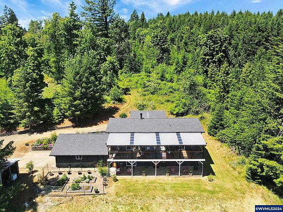 Your own private, gated, retreat nestled on 5 acres. Beautifully remodeled home, full kitchens on both levels. Main kitchen with dual fuel propane/electric range, quartz countertops, large quartz island w/ bar seating, stainless appliances. Covered deck spans length of home. Newer windows, roof & exterior paint. Barn has water/power, chicken coop & wood shed. Adjacent 15.25 acres also available - MLS 815089 features old-growth marketable timber, seasonal creek & pond. Properties must close simultaneously.