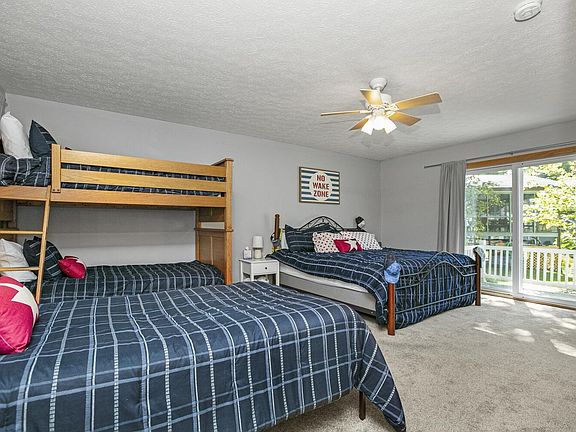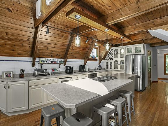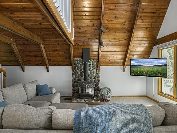 This charming three-bedroom, two-bath, 2,282-square-foot A-frame in the close-knit The Cove community on the north side of all-sports Birch Lake is move-in ready with most furniture and furnishings included. It overlooks the waterfront with sandy beach, dock, and firepit from a large, landscaped wraparound deck with a retractable awning. Inside are a living area with vaulted knotty pine ceiling with exposed beams, wood-burning stove, panoramic views, and deck access; a kitchen with a large 10-foot island with bar seating and stainless appliances; a dining area; a large bedroom with deck access; a bath; a bedroom with a bath; and a laundry/storage area with a long shelf/cabinet and second refrigerator. Upstairs are a loft with a seating area, bedroom, and skylight. A detached 36- by 24-foot garage has an upstairs living quarters with bath. The property includes a new furnace, air conditioner, water heater, and dishwasher, columned streetside entrance, and abundant off-street parking.