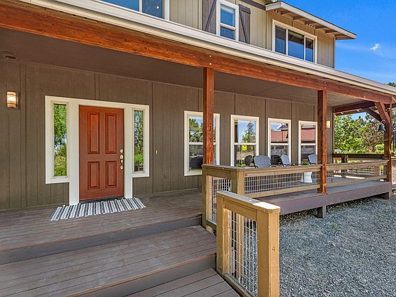 Discover this perfect hobby farm just outside Bend! This one of a kind property features a beautiful farmhouse, barn/shop with 4 stalls built in 2021, a round pen, arena, and two fenced pastures. The home boasts a welcoming front porch and energy-efficient features. Inside, the open floor plan includes solid craftsman birch flooring, a cook's kitchen with island seating, high-end SS appliances & custom knotty hickory cabinets. The dining area has a cozy corner fireplace. The family/bonus room includes a wood-burning stove. Upstairs, you will find 3 bedrooms & 2 full baths, including a primary suite with engineered bamboo flooring & a heated floor in the primary bath. The custom detached garage/shop includes four bays, a 220V outlet & workbench. The property is landscaped like a park with a pond & private paver patio with a firepit & hot tub, offering breathtaking views of the Cascade Mountains. Manufactured home on property is of no value and used primarily as storage.