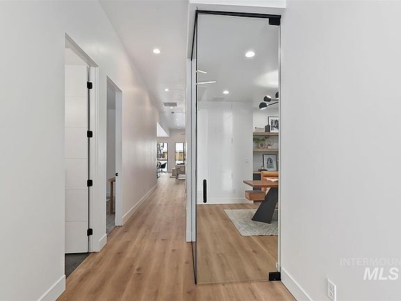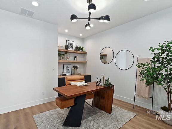 This beautiful split bedroom floor plan offers 3beds/2 baths + glass wall office off of the entry with an extra deep (42ft) garage bay! Inside you will find high end finishes throughout such as custom cabinets, full height tile fireplace, full tiled bathrooms and incredible finish work. The two large sliding doors in the great room and dining room offer tons of natural lighting making it feel warm and bright throughout. Moving into the owners suite a soaker tub and full tile walk in shower gives a spa like touch that flows into the closet and laundry room. Located minutes away from both Pierce Park Greens & The River Club -- With quick access to the foot hills & downtown Boise makes this location hard to beat!