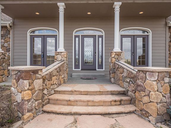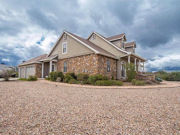HOME HAS BEEN LEASED FOR 1 YEAR WITH OPTION TO BUY. Custom country style view home on private level acreage for sale in Prescott, Arizona. No HOA! Ride your horse, bike or hike to nearby National Forest trails. Room for RV and horse trailers. Private well plus 2600 gallon storage tank. Classic front porch with columns and rock detailing. Great room with ceiling-to-floor rock fireplace, vaulted ceilings with skylights, hardwood floors, granite counters in kitchen, large breakfast bar, glass-fronted cabinets. Huge paver patio with built-in grill for four-season entertaining, Master suite on main with soaking tub, double vanities, shower. Bonus room upstairs for office, media, home schooling