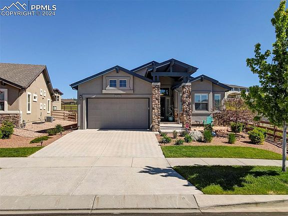 This Ranch Plan with a craftsman elevation is located on a corner lot with full landscaping in the desirable low maintenance community of Daybreak at Wolf Ranch. Features main level living at its finest cozy up in the great room in front of the gas fireplace. Open floorplan and a large kitchen with island for entertaining. Wood floors and lots of window. The master suite is accompanied with a 4-piece master bathroom and walk-in closet that is conveniently attached to the laundry room! There is a 2nd bedroom or study, full bathroom, and laundry to complete the main level. The finished lower level with 9' ceilings and spacious family room that is pre plumbed for a wet bar, 2-bedrooms, one with a walk-in closet and a bull bathroom complete the lower level! Don't miss the beautiful Pikes Peak views from the covered outdoor patio and relax with the sound of the running water from the waterfall feature.