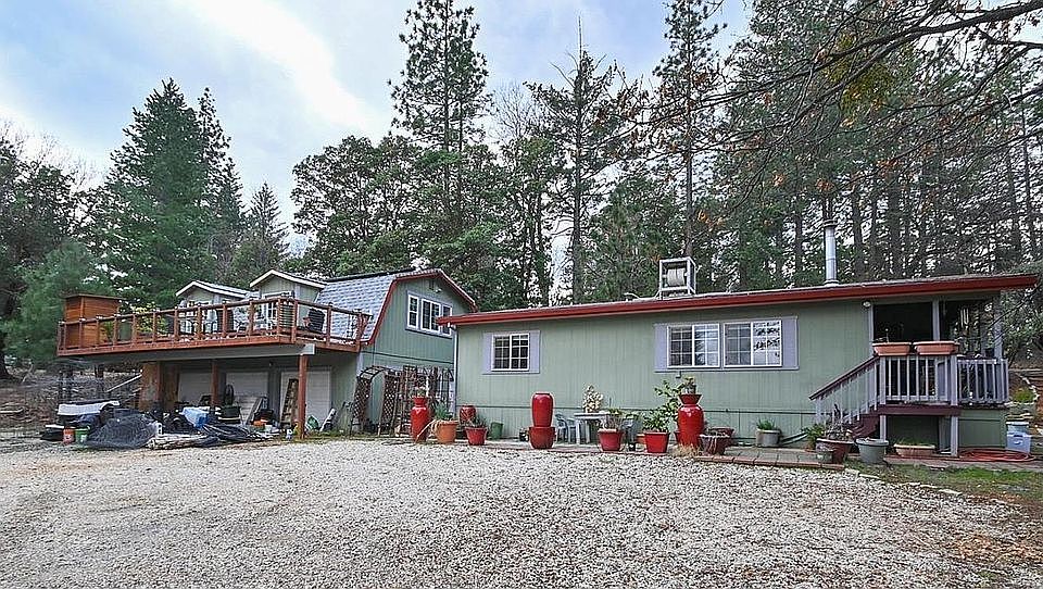 If you are looking for seclusion you have found it. This property offers a 2-bedroom, 2 bath manufactured home with inside laundry 882 Sq. ft. It has a cute covered front porch, updated bathrooms, and open floor plan. A detached 3 car garage. Above the garage there is plenty of storage with a finished gorgeous trex decking that wraps around the front of the storage areas. With a new sauna and plenty of room to BBQ or sip coffee while enjoying the gorgeous views. The property offers paid for solar. Did I mention a Generac system too, along with 3 storage sheds? The almost 5 acres is perfect for a serious gardener with water hoses to keep the many fruit trees (kiwi, apples, fig, apricot, pear, pecan, mulberry, blueberry, 4 grape vines and cherry) nourished.