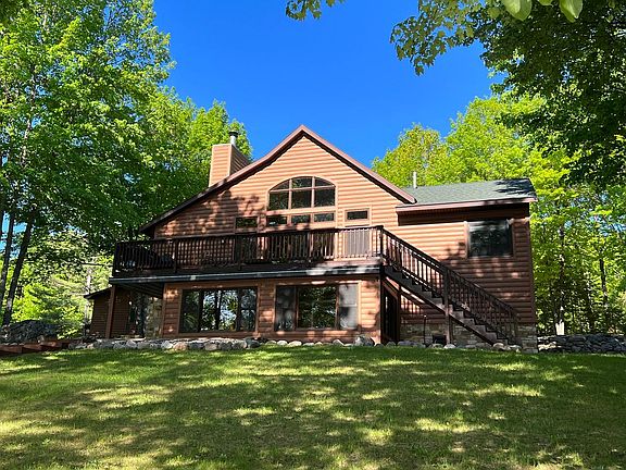 Spectacular 4-bed 4 ba custom home presenting 180’ of beautiful sand frontage on the Turtle Flambeau Flowage! This stunning South lake view showcases picture perfect islands & State Owned undeveloped land across the lake as far as you can see! Attractive covered deck entry with stone pillars welcomes you into this bright open concept great room featuring an impressive wall of WF windows, towering cathedral ceiling, stone fireplace & granite Ctops. Private Msuite complete w/ WF sitting/office area, w/in closet & striking MBa. 2 addl bedrooms & full ba complete main level. Lg loft bd w/ ½ ba up & finished walk out LL offers a striking wetbar & custom stone/Walnut wavy edge top! Full ba, sleeping rm, laundry & fantastic WF 3 season porch leads to covered deck & concrete patio. Gentle walkway to the lake, WF shed, firepit, big deck & 2 finished storage rms for gear! The home & 42x24’ heated gar feature hand-hewn log siding & beautiful stone. Every bit of gorgeous on this incredible lake!