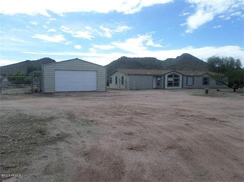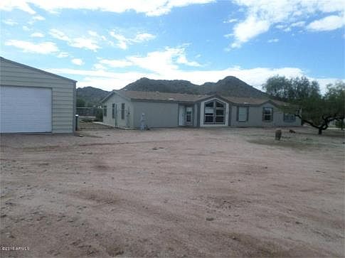 Great Home! Horse property with arena, stalls w/water&elec for your horses.Bkyd also has elec. Faces Superstition Mountains view and State land borders property, riding trails and beautiful view. This home has two main living areas, split floor plan, open kitchen w/island & w/eating area,built in curio cabinet, a view of back yard with full covered patio w/mist system. North/South Exposure. Additional 24x35 Garage for the handyman or to put your toys.Mature landscaping,fruit trees. Newer AC.Satalite TV, Soft water loop, RV gate.Refg/W/D stay. So much to mention!See for yourself all this property has to offer! Landscaping included. New carpet and other items throughout the home are new.