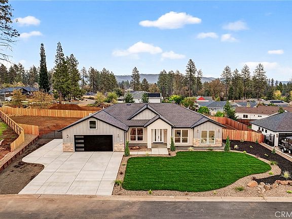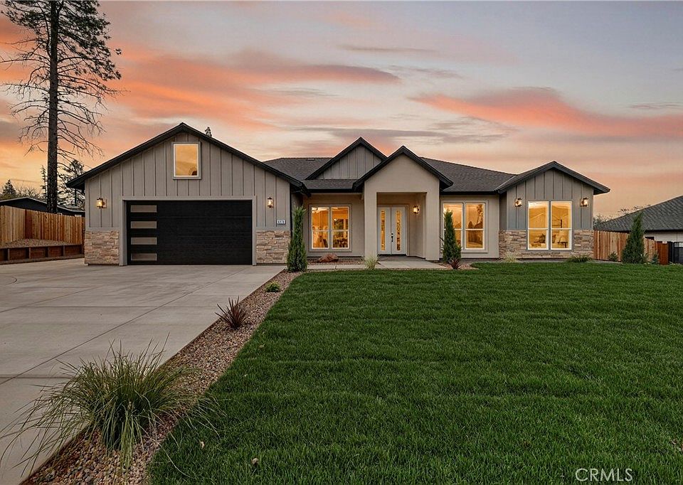 This exceptional brand-new modern farmhouse offers 3 bedrooms + dedicated office/den, 2.5 baths on a private court lot with landscaped grounds and full irrigation. High-end finishes include Calacatta-style quartz counters, two-tone white and rift oak cabinetry, matte black fixtures, and upgraded premium waterproof laminate flooring in a natural European oak finish. Open great room flows into a gourmet kitchen with dramatic waterfall island, paneled stainless appliances, full-slab backsplash, and gold-accented pendant lighting. The dedicated office/den features a custom wood slat accent wall. Primary suite delivers a spa-inspired bath with dual floating vanities, frameless glass shower with rainfall head, sculptural freestanding tub, and spacious walk-in closet with built-in organizers. Additional upgrades: owned solar panels, tankless water heater, dual-zone HVAC, laundry room with sink and storage, and oversized 2-car garage. Gated RV parking. Turnkey luxury in every detail.