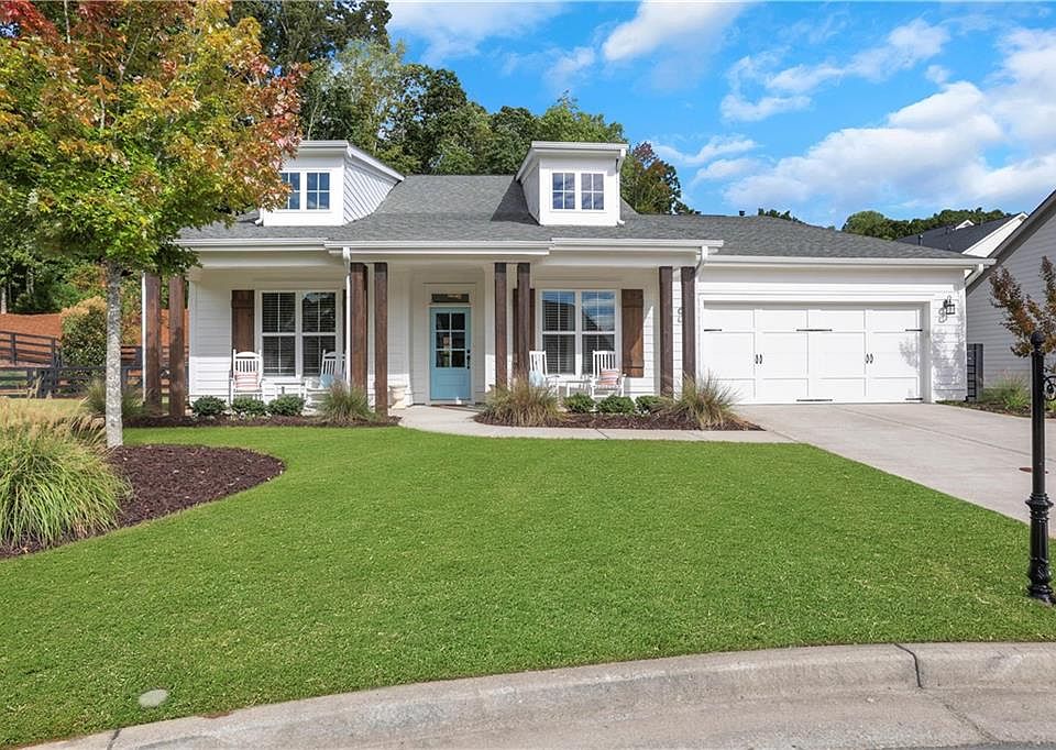 Stunning ranch home located in the highly sought-after Larkspur community, situated on a private, spacious lot at the end of a peaceful cul-de-sac. It offers exceptional curb appeal with professional landscaping and tranquil views of nature from the backyard. Inside, you'll be greeted by a bright, open-concept layout filled with natural light and high-end finishes throughout. The chef's kitchen features quartz countertops, a large island, stainless steel appliances, and a customized pantry with a built-in full-size refrigerator. Perfect for entertaining, the kitchen opens seamlessly to the main living area and leads outdoors to a large, covered patio with an extended 8 x 20-foot concrete pad and a newly fenced backyard—ideal for outdoor gatherings. The owner's suite is a true retreat, featuring a spa-like bath and a custom closet. Additional highlights on the main level include an office and a laundry room with ample storage and a folding table. Upstairs, you'll find a large media room with a custom shelf system, an extra bedroom and bathroom, and additional attic storage space. Outside, the home offers an extra brick paver parking pad, a walkway, dedicated refuse storage, and newly installed gutter guards. There is so much to love about this home and community! Enjoy main-level living with yard maintenance included. The property backs up to nature for ultimate privacy. The gated community offers incredible amenities, including a swimming pool, clubhouse, pickleball courts, a walking trail, and a community garden. Located in a top-rated school district, this home boasts an Alpharetta address with the benefit of low Cherokee County taxes.