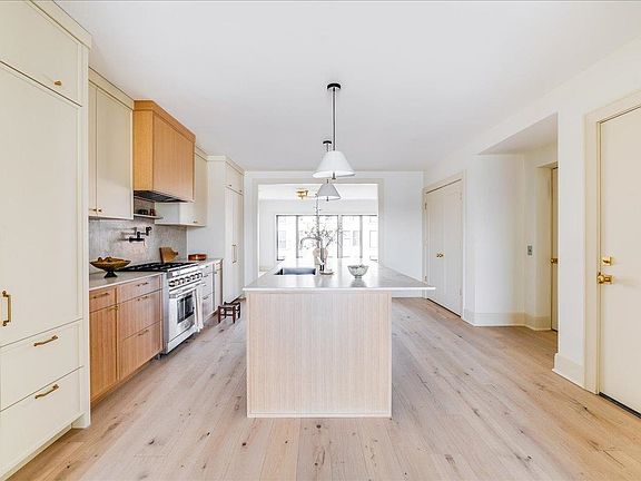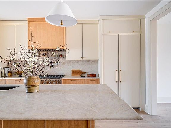 The state-of-the-art kitchen is a chef's dream, equipped with a Sub-Zero Wolf appliance package, direct outside venting, under counter lighting, a Bosch panel-ready dishwasher, and breathtaking Taj Mahal honed quartzite countertops and backsplash. Stylish pendant lights illuminate the custom white rift oak and matte lacquered cabinetry.