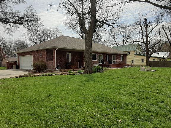 Nice 4,000+ sq. ft., 4-5 bedroom, 4 bath, brick ranch home located on 3 corner lots. Built in 2003. Open floor plan with vaulted ceiling and wood floors on main floor. Large master BR , bath and walk in closet. Kitchen and bathroom cabinets from Custom Wood Products. Inc. Walk out finished basement with full kitchen. 2 car attached garage and 3 car detached garage. Built with 6 inch outer walls, Marvin windows, 3 ft wide 6 paneled solid oak doors, large walk in closets in 3 BR's, and large storage room in basement. Plenty of yard with large garden plot. Spacious deck. Re-roofed in summer of 2019, tankless water heater installed 2014 and new air conditioner 2016. Move-in ready. For more information or to schedule a viewing, please call or text 620-203-0213 Outside Video 1: https://www.youtube.com/watch?v=uGM7L6VKaxI&feature=youtu.be Outside Video 2: https://www.youtube.com/watch?v=EfzYY6iAAVQ&feature=youtu.be Outside Video 3: https://youtu.be/kjWQonmtuCs