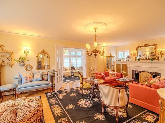 The main level welcomes you with a grand living room centered around a wood-burning fireplace. Double French doors lead to a bright sunroom, offering an inviting space for relaxation or entertaining. The formal dining room, rich with traditional details, provides an elegant setting for gatherings.