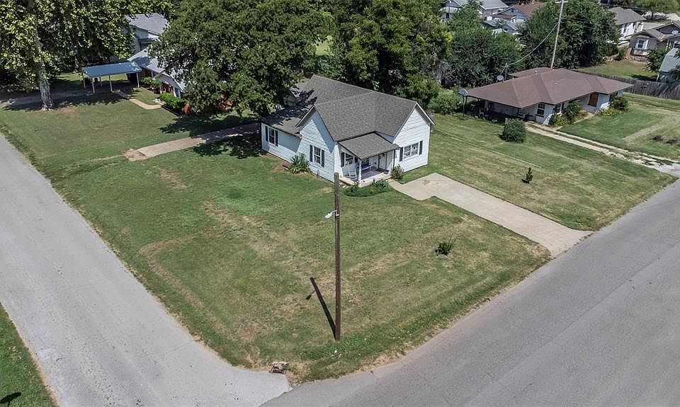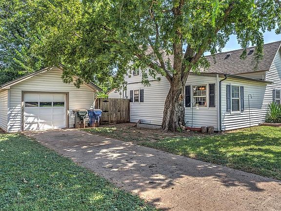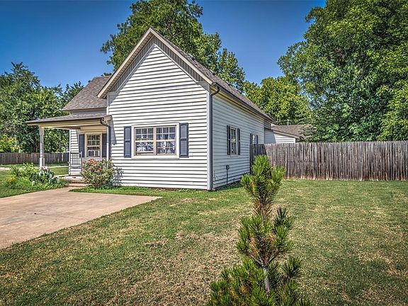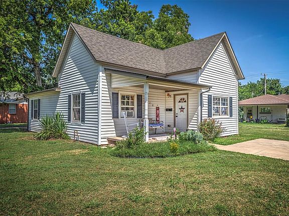 Price Reduced! Sweet farmhouse-style home has corner lot curb appeal. Outside you'll find a sitting porch, two driveways, a detached garage with recently added storm shelter, plenty of parking area and outdoor space as well as a private backyard. Downstairs there are two ample bedrooms, a bath with corner tub & shower, country kitchen, spacious living/dining area and storage room. Upstairs, there is a cozy bedroom with half bath. Updates include new laminate flooring in the downstairs bedrooms and hallway (extra flooring can remain with the property) and a 2022 roof with rain gutters. Located in Central Chickasha, within walking distance to Centennial Park, close to shopping, conveniences and historic Chickasha.