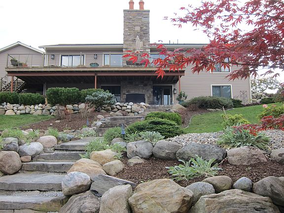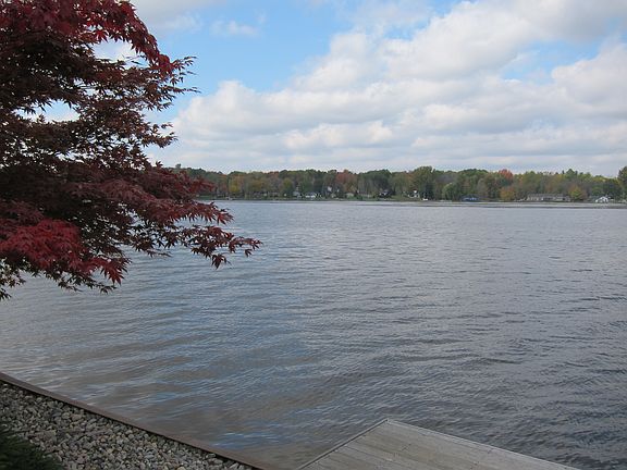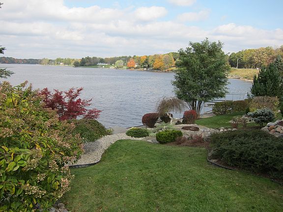 Enjoy sunset views across Sanford Lake. On 114 ft of waterfront, this raised ranch with 3,005 sq ft will make every day feel like vacation. Ideal for family living and entertaining friends. Located in the quiet wooded area of Rivers Edge. Updated kitchen, baths, and deck. Lower patio has outdoor fireplace and overlooks beautiful landscaping, fire pit, limestone steps to your dock, and Sanford Lake.