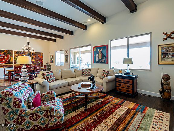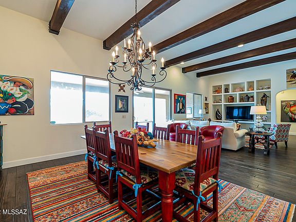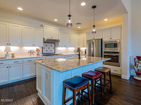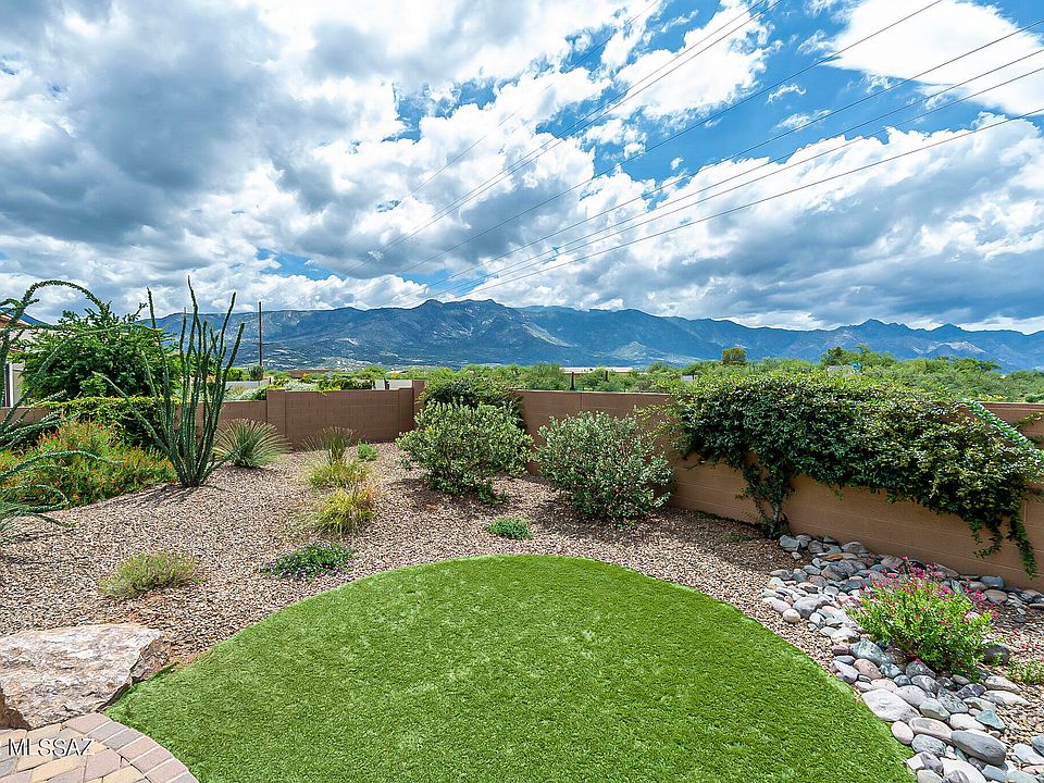 Stunning, unobstructed Catalina Mountain views from this beautifully designed & upgraded Pima model! This home has it all! Great room concept w/large, granite topped kitchen island + buffet, 5 burner GE Profile gas stove, SS appls, trendy white cabs w/pull outs, dark wood plank flooring throughout home, huge walk-in pantry, tasteful built-in media/art display wall, dark wood beams on ceiling, generous sized dining area. Split bedroom plan w/large master suite, bay windows, shutters & Classy Closets, 2 lovely guest bedrooms w/shutters, powder bath. Enclosed front porch w/decorative security door, pavers on driveway, porch & full covered patio. Flagstone topped seating area w/SS BBQ. Gorgeous landscaping features 3 native Saguaro cacti! Make this sensational SaddleBrooke gem yours!