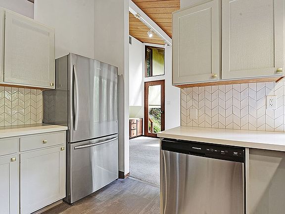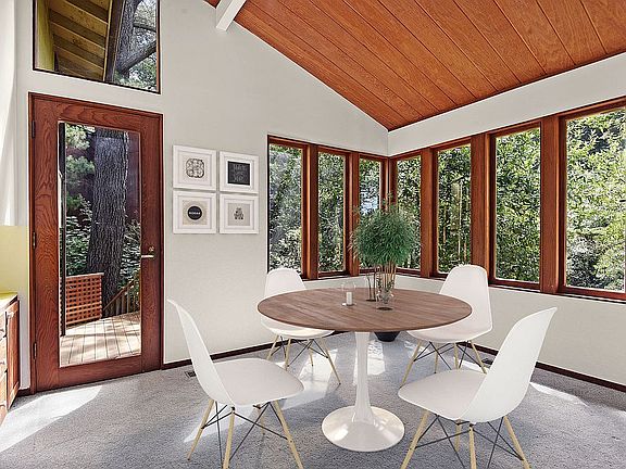 Personal home of architect. Custom built, mid-century modern, light-flooded house with 2021 designer remodel. Brand new Kitchen & Bath appliances/fixtures, new flooring and interior paint throughout. Unique property surrounded by mature forest. Private "tree-house" feel. Multiple outdoor decks, ample parking for 3 cars, detached carport and woodworking shop. Lots of storage.