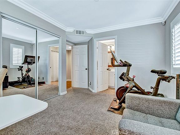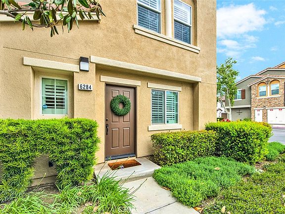 Beautiful Eastvale condo located in the gated community of Serafina. Desirable end unit with no one living above or below you. The first floor includes the first of two primary bedrooms with an ensuite bathroom. Bedroom offers plantation shutters, crown molding, and mirrored closet doors. Also on the first floor is a large storage closet and a laundry closet that houses the washer and dryer. Upstairs includes an open floor plan featuring the living room, dining room, half bath, second primary bedroom, and kitchen. The kitchen is highlighted with stainless steel appliances, granite countertops, and white cabinetry. Living room with laminate wood flooring, recessed lighting, cozy fireplace, plantation shutters, crown molding, and a quaint half bathroom. Dining area is adjacent to living room and has ceiling fan, plantation shutters, and french door leading to private balcony. The balcony is perfect for morning coffee or evening relaxing. The upstairs primary bedroom has a walk-in closet with custom built-ins, plantation shutters, crown molding, and ceiling fan. The ensuite bathroom includes a dual sink vanity with granite countertops. The attached two car garage with convenient direct access to home. The Serafina community is ideally located close to major shopping centers, restaurants, and easy access to the 15 freeway.