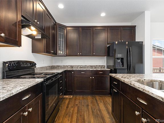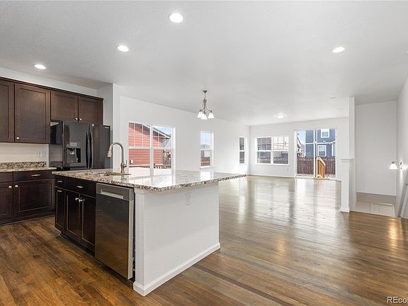 This stunning Craftsman-style ranch home offers the perfect blend of charm and modern convenience. With six bedrooms, there’s plenty of space for everyone. Ideally located just minutes from Peña Blvd and E-470, it provides quick access to DIA and a growing selection of shops and restaurants. Built with energy efficiency in mind, this home is Star Energy green built and HERS rated. The west-facing lot includes front and backyard landscaping with irrigation already installed. Inside, the open layout seamlessly connects the kitchen, living room, and dining area, all enhanced by wood floors and a neutral color palette. The spacious kitchen features a large island with seating, 42-inch cabinets, and an expansive dining area. The finished basement includes a full suite, making it ideal for an in-law setup. A full privacy fence encloses the yard, creating a perfect space for kids or pets. This move-in-ready gem is waiting to welcome you home.