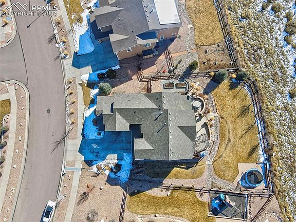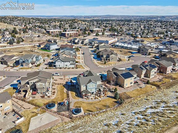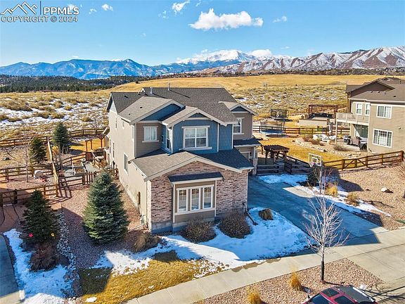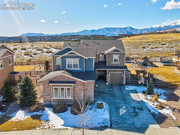 This stunning 2-story home has Pikes Peak views & is situated on a premium lot, backing to open space/trails. This conveniently located home is close to all Colorado has to offer: Garden Of The Gods Park, Ute Valley, Blodgett Peak, Award winning D-20 schools, biking/walking trails, shopping, restaurants, access to downtown & close proximity to I-25 & the Air Force Academy! When you walk into this stunner you are greeted with a grand staircase, beautiful wood floors, 19' ceilings, an open floor plan & an abundance of natural light throughout. The living room has a stone surround gas fireplace, built-ins and wall of windows looking to the backyard & open space. Just around the corner you have an office/bedroom and a full bathroom. The main level also offers a gourmet kitchen with SS appliances, an oversized island, granite counter-tops, gas range, double ovens, walk-in pantry, a nook with built-ins, a perfect place for homeschooling or casual dining, and a designated eating space. Off the dining area you can access the breathtaking and fully fenced and landscaped backyard space including a built in gas grill with granite countertops, a dedicated eating area, sitting area around a huge gas fireplace, fenced area with raised garden beds and storage shed to the side of the home. Upstairs enjoy 4 bedrooms and laundry room including the decadent primary suite with fireplace, built-ins, huge walk in closet, double vanity, frameless led lit mirrors, large tile shower and soaking tub. In the basement you have the 5th bedroom, a full bathroom, storage room, theater room with projector and screen, rec area with web bar, and secret storage space behind the bookshelf. There is a radon mitigation system in place as well as two A/C units, and two furnaces for heating and cooling the different levels of the home. This home has an absolutely incredible location, on a prime lot, with privacy, mountain views, and nature right out your back gate!