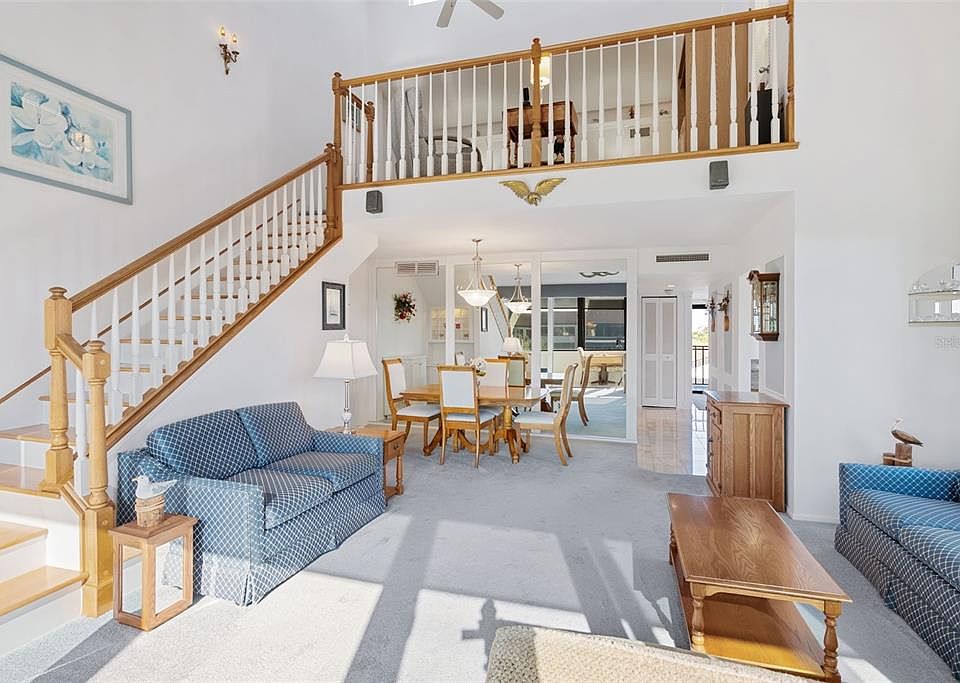 Welcome to this beautiful Penthouse end unit at the highly desirable Excelsior Beach to Bay community. Perfectly positioned on the Bay side, this 2 bedroom, 2.5 bath condo offers an open, airy layout enhanced by vaulted ceilings, abundant natural light, and impact windows throughout for peace of mind and energy efficiency. The living and dining areas flow seamlessly together, creating an ideal setting for entertaining or relaxing. The dining area features a mirrored accent wall, a built-in cabinet under the stairs, and another built-in at the end of the room for elegant storage and display. A wood staircase leads to the loft, a rare feature in this complex. The spacious loft includes a half bath, and 2 generous closets, offering flexibility as a guest retreat, office, or media room. The loft expands your living options beautifully. The kitchen is both functional and stylish, featuring wood cabinetry, Cambria quartz countertops, marble floors, a tray ceiling and a built-in eat-in area/desk. A window over the sink provides a charming peek of the Bay. The Primary Bedroom impresses with soaring vaulted ceilings, custom built-in furniture, and a bright, open feel, while the Primary Bath offers two separate sink areas with granite counters, built-in cabinetry, and a wall of closets-providing abundant storage and space. Pella sliding glass doors lead to the Florida room/lanai, enclosed in glass and framed by vaulted ceilings invites you to relax and enjoy tranquil views year-round. Residents of Excelsior enjoy private beach access, along with two heated pools, fitness center, tennis and pickleball courts, and clubhouse. Whether you’re seeking a full-time residence, vacation getaway, or investment opportunity, this Penthouse condo offers a rare blend of comfort, style, and location.