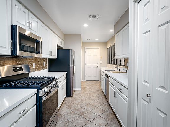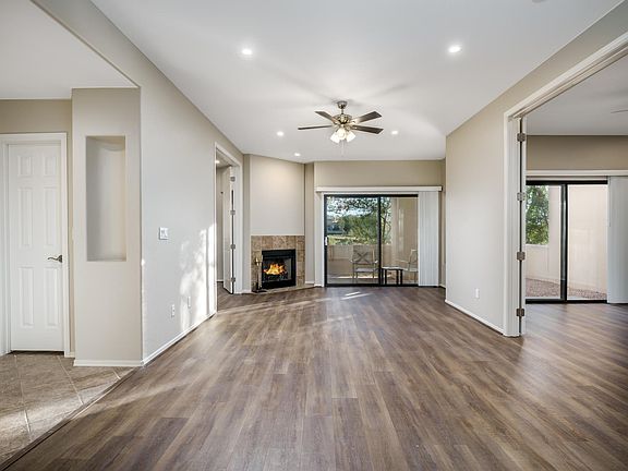 Interior Features: The condo has an open concept living area with a fireplace, high ceilings, and access to a small patio from the primary bedroom and living room. The kitchen is equipped with new stainless-steel appliances, quartz countertops, and a modern sink. Both bedrooms have their own bathrooms, with the primary bedroom featuring a walk-in closet. The bathrooms are updated with new shower enclosures and fixtures.