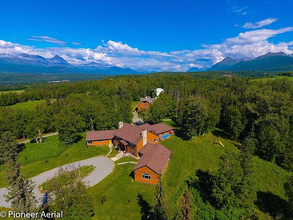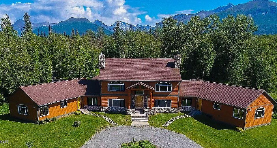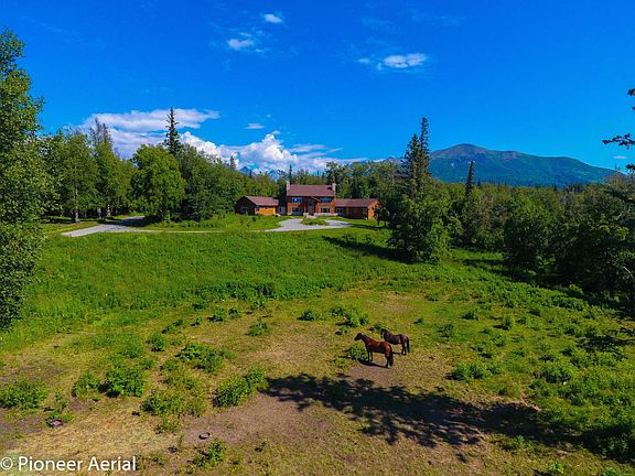see the 3D Immersion Tour. Beautiful 38 acre Equestrian Estate in Palmer, Alaska 6500 sqft home with cherry wood flooring. Property includes a 5,400 sqft heated 8 stall barn + 76x250 riding arena and attached corral (plus on and off property trails) - all in a visually beautiful and protected setting an hour from Anchorage. Concrete block foundation is a solid pour. Wood stove in each wing. A beautiful wood stove/wood furnace with floor to ceiling stone chimney in living room., Beautiful main kitchen with solid surface counters including a 12 foot island. Bedroom count does not include the library, or apartment over barn. Bathroom count does not include two bathrooms in the barn. There are 3 complete sets of washers and dryers in three laundry rooms. Three full kitchens including range, dishwasher and refrigerator in each kitchen. There are three jetted tubs and three separate air exchange systems.
