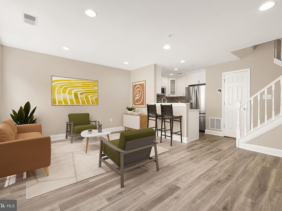Welcome home to this fully renovated townhome that features three bedrooms, two full baths, and one half bath, spread out over 1,300 square feet. As you step inside, you'll notice the brand new, durable wood-look LVP flooring and freshly painted walls throughout. The open living and dining area is filled with natural light from the front windows and flows seamlessly into a beautifully updated kitchen with crisp white shaker cabinets, quartz countertops, and stainless steel appliances. There's also a handy half bath with updated fixtures on this level. Head upstairs to find two bedrooms with plenty of closet space, along with a full bath. The third floor is your private retreat, with a spacious primary suite that includes a large bedroom with a floor-to-ceiling sliding glass door that leads to a cozy balcony, a generously sized walk-in closet, and a well-designed primary bath. You'll love the community amenities, including an outdoor pool, a tot lot, and walking paths. Nearby, you'll find the newly renovated Elkridge Library, an education center, a senior activity center, and the Elkridge Volunteer Fire Department, which hosts fun events like food truck festivals and weekly bingo. Convenient commuter routes like MD-175, I-95, and Route 1 make it easy to get to Columbia, Ellicott City, Baltimore, Hanover, and beyond. Plus, there are plenty of shopping, dining, and entertainment options at Columbia Crossing, The Mall in Columbia, Merriweather Post Pavilion, and Arundel Mills. For outdoor fun, check out Blandair Regional Park and Long Reach Park. **SOME PHOTOS ARE VIRTUALLY STAGED **
