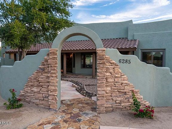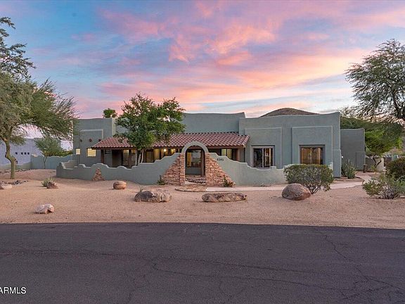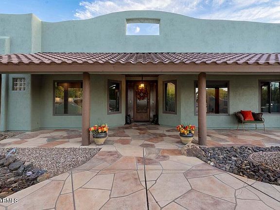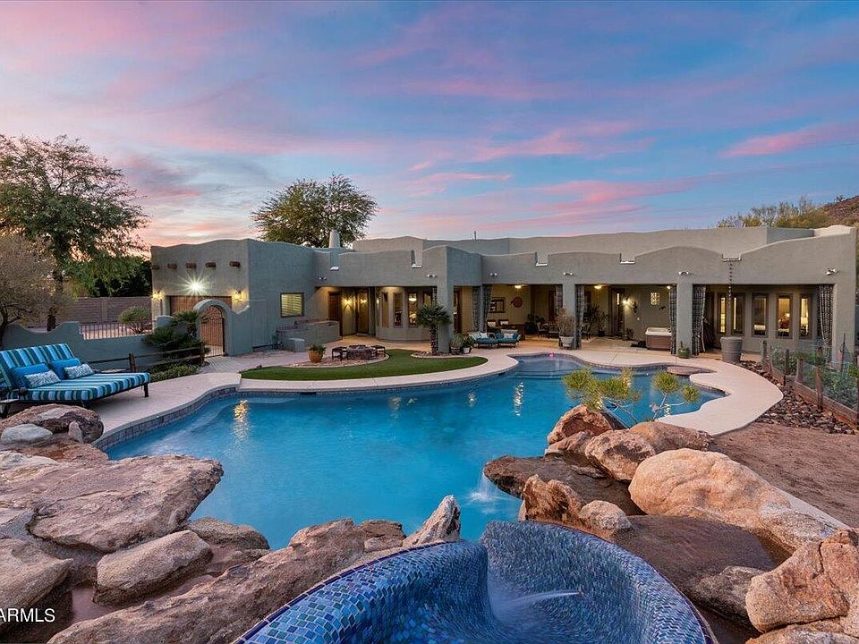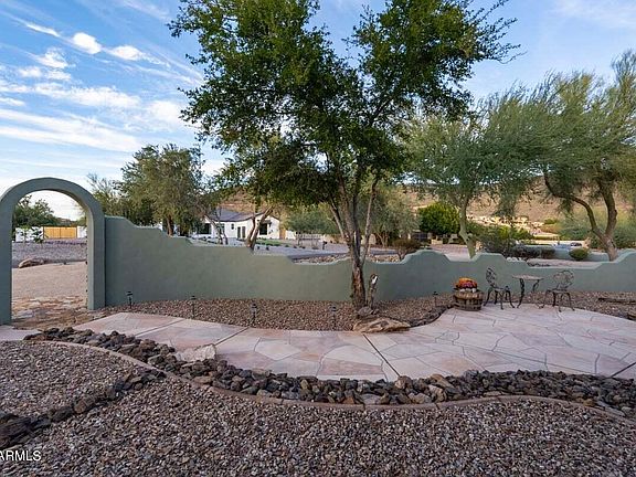 Premium corner lot boasting 1.2+ ACRES! This meticulously crafted custom estate showcases unobstructed MOUNTAIN VIEWS, NO HOA, a private front courtyard, 2 RV GATES, fully equipped detached GUEST CASITA with RV GARAGE & more! The open concept floor plan offers 4 spacious suites, an executive office, extended length/depth/height garage, laundry room with a sink & ample storage throughout. Enjoy soaring ceilings, recessed lighting, a rustic Kiva fireplace, kitchen with maple wood crown molded cabinets, Thermador 6-burner range, walk-in pantry, quartz countertops (2021), tile backsplash & stainless steel appliances. The resort-style grounds present low maintenance artificial turf, a gardener's greenhouse, 6' deep pool with a waterslide, grotto, multiple water/fire features, serene pond - a plethora of citrus trees & direct bathroom access off of the covered patio This gem won't last long - don't miss your chance!