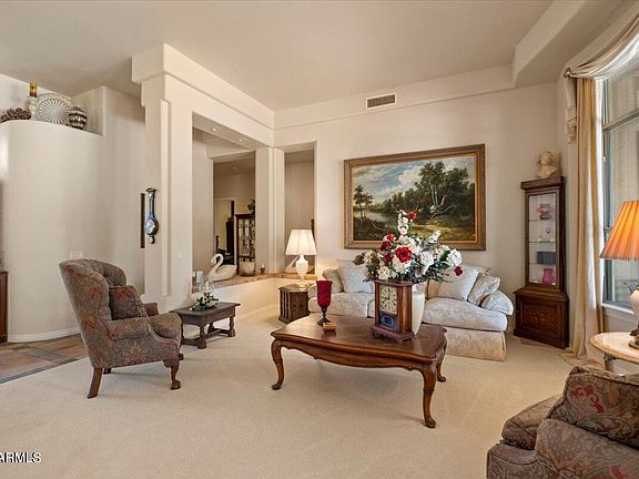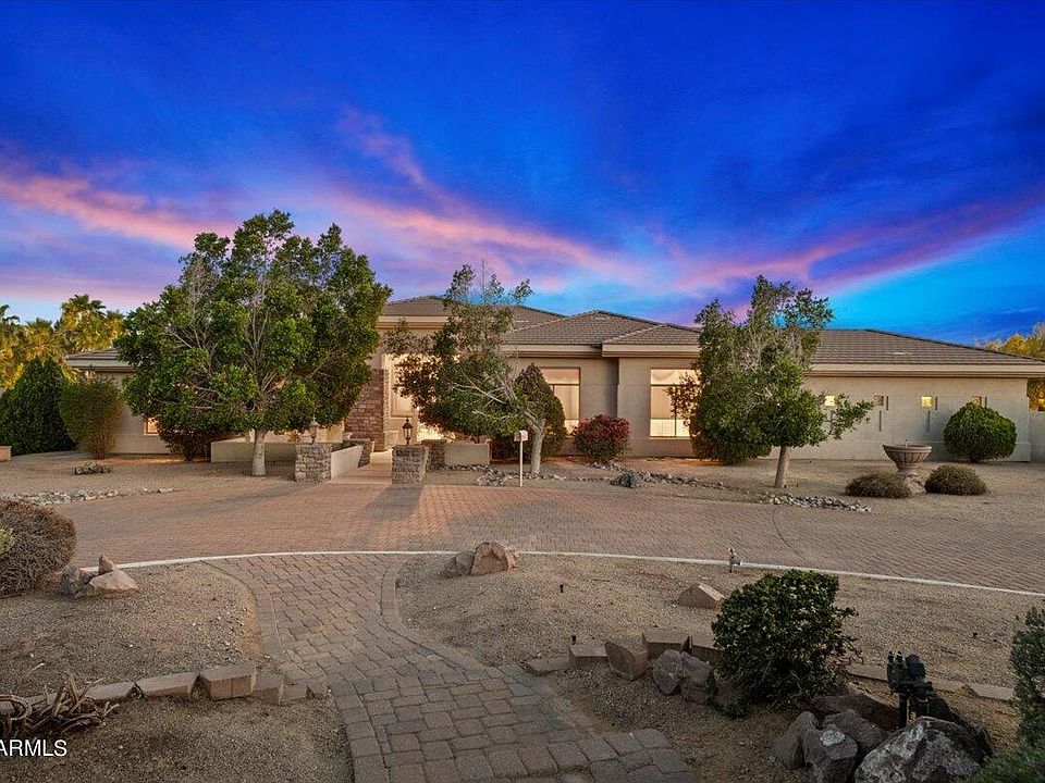 Perched on a privately gated 1+ acre irrigated lot, this energy-efficient Stellar custom estate is settled on a secluded dead-end road offering pristine privacy, NO HOA, panoramic mountain views, an expansive horseshoe paver driveway, oversized 3-car epoxy garage, detached 1200 sqft garage/shop & easy access to adjacent Thunderbird Conservation Park + trails! Prepare to be greeted by a tranquil front courtyard, beautiful bay windows, Hunter Douglas shades, abundant natural light, soaring custom ceilings, family room surround sound & multiple french doors for seamless indoor / outdoor living. Retreat to any of the 5 graciously sized bedrooms & relish in the pristine primary suite with a sitting space, clerestory windows, direct french door access to patio, dual vanities -- & large walk-in closet. Chef's open-concept kitchen is complete with granite countertops, ample maple cabinetry + pull-outs, Kinetico soft water, R/O filtration, walk-in pantry & eat-in center island. Enjoy plenty of space to lounge or entertain in your personal Sonoran backyard oasis equipped with a resort-style 6' deep pebble finish pool, relaxing boulder waterfall, spacious misted covered patio, built-in BBQ & ambient fireplace. Don't miss your chance!