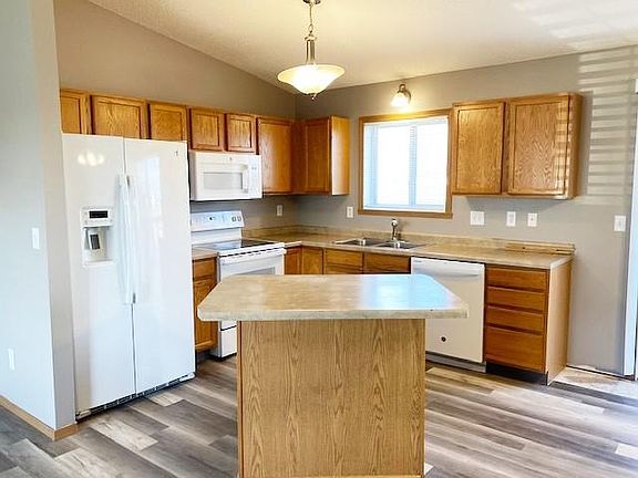 This home is amazing and ready for move-in! Completely repainted, brand new vinyl plank flooring in the upper level, newer carpet throughout. Brand new washer and dryer just delivered. Bring your small breed dog and enjoy the large fenced yard with deck and stained concrete patio! Double garage with opener. Location next to walking trails, and park. Renter pays electric heat, electric, water, sewer, and garbage. Renter responsible or yard and snow.