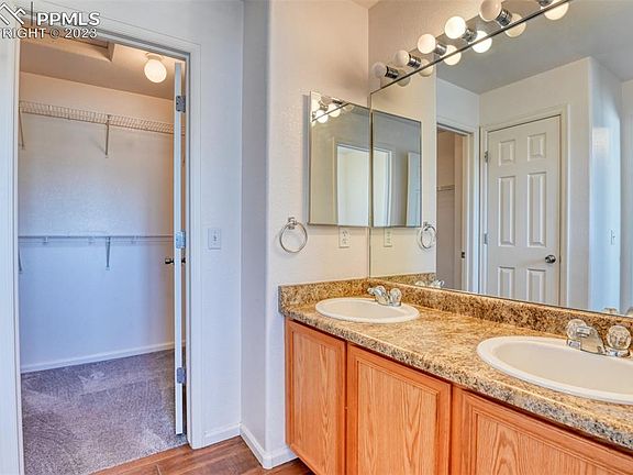 Discover this charming townhome nestled in the Dublin Townhome neighborhood. You’ll find a meticulously cared for residence that boasts two spacious bedrooms and three well-appointed bathrooms. Recently upgraded with stylish and durable luxury vinyl flooring throughout the main level. The primary suite is a true retreat, featuring a generously sized carpeted bedroom and an ensuite bath with a double vanity, tub/shower combination and walk-in closet. A second bedroom offers versatile space for guests or a home office. Upstairs you’ll find the conveniently located laundry room that comes with the washer and dryer units. Protect your vehicles from the element and enjoy extra storage in the attached 2 car garage. Green space in front of the home allows for easy dog walking with mountain views. The property's prime location on the Powers corridor offers close proximity to shopping, schools, and entertainment options. This inviting townhome presents an ideal blend of comfort, style, low maintenance and convenience in a sought-after neighborhood.