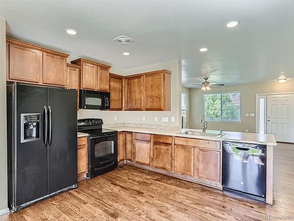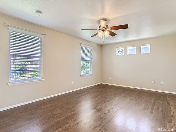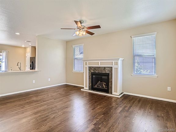 Don't miss this charming 5 bed, 4 bath home in the heart of High Point DIA. The main level features recently refinished hardwood floors throughout. Step into the main living area, featuring a cozy and inviting gas log fireplace. The eat-in kitchen gives way to the pergola-covered stamped concrete patio, ready for entertaining. Four bedrooms on the second level are highlighted by the spacious hardwood floored primary bedroom, with large walk-in closet, full private bath, and mountain views. New flooring is featured in the other three upper bedrooms. The basement features the fifth bedroom, bath, and generous family room. The large neighborhood park and pool are just a block away with trails close by. This home is minutes away from numerous restaurants and within walking distance to the Gaylord of the Rockies Resort as well as the neighborhood K-8 charter school. For the traveler, this home is minutes away from Denver International Airport and close to all major thoroughfares.