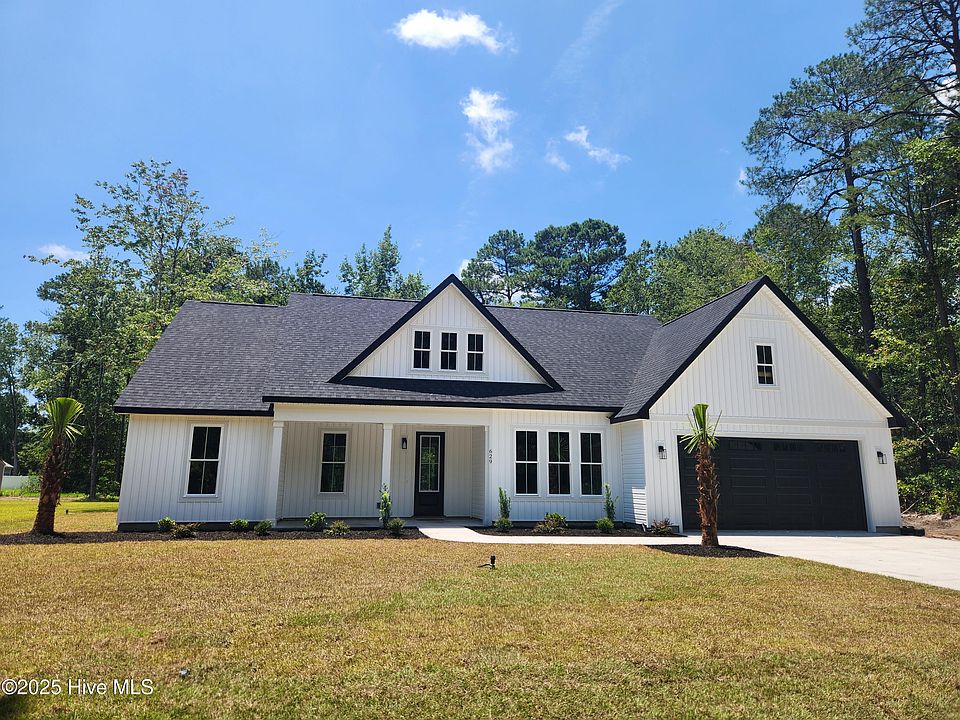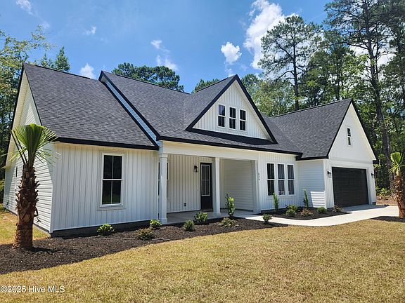 Modern farm house style new construction custom designed home with 3 bedrooms , 2 baths , and a office/flex room located in Carolina Shores North. When entering the home, you are welcomed by the large living area which features wooden beams in the ceiling and extra windows for more natural light. The kitchen offers quartz countertops, farm sink, oversized island, and stainless appliances, including, dishwasher, microwave, and range. The all-wood cabinetry comes with easy close doors and drawers. There is a large pantry off the kitchen next to the oversized laundry room that features built in cabinets and quartz top. The dining area is beautifully finished with wainscotting and crown molding in the trey ceiling. The living area has custom wooden beams in the ceiling with ample room for entertaining and opens to a huge covered back porch. The master bedroom offers a trey ceiling with crown molding and a large walk-in closet. The master bath comes with dual vanities, quartz countertops, and custom tile shower. Master closet has built in wood shelving. This home has 9' walls with 6' windows, not the standard 8' walls with 5' windows. The home features an oversized 8'x18' garage door, along with gutters. The hot water heater is located inside the oversized garage with extra room for storage.