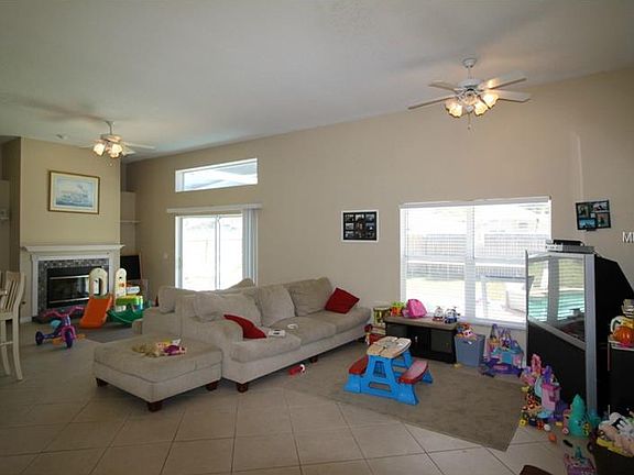 Spacious, well maintained Disney area pool home with great curb appeal in desirable community located near theme parks, shopping, restaurants, golf courses, hospitals, hwys and more! Bright and airy with high ceilings, beautiful tiled floors and neutral colors. Huge, open family/great room with gas fireplace, ceiling fans and lots of windows. Separate, open dining area. Double sinks, large Jacuzzi tub, separate shower and pool door in master bath. Many improvements including a high efficiency A/C system with redesigned and upgraded duct work resulting in major utility savings. Decorative arch entry, extra closet pantry and recessed lighting added to kitchen. Wood flooring and ceiling fans in all bedrooms. New shower in master bath. Exterior painted and new pool pump in 2014, new garage door opener and door springs, garage attic space improved with lighting, flooring and folding access stairs. Gas water heater, stove and dryer help save on utility costs but are also wired for electric. Large deck and sparkling pool is screened-in with accent lighting and overlooks fenced yard and mature palm trees. Perfect for entertaining or privacy! Many extras including lightning rods on roof, automatic sprinklers, Zoysia grass (hearty & durable). All appliances stay! This home also has special zoning that allows it to be used as a primary residence, vacation home or income-generating rental. Community amenities include pool, volleyball, basketball & tennis courts and playground. Very reasonable HOA fees! Don't miss it!