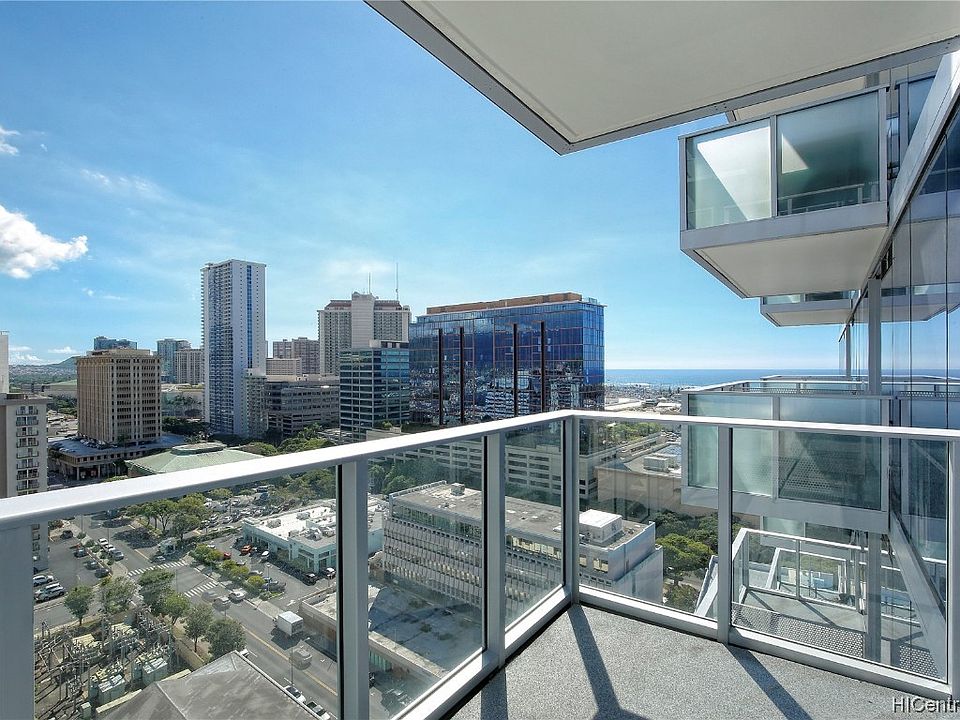 This stunning 1 bdrm, 1 bath, 654 sqft home provides a spacious layout with modern finishes. Floor to ceiling windows show an amazing city view and gives the unit a bright and airy feel. The kitchen boasts Bosch appliances and custom cabinetry. Quartz countertops and polished Hansgrohe plumbing fixtures add to the sleek design of the kitchen and bathroom. Comfortably carpeted in the living areas w/porcelain tile in the kitchen and bath. The unit is also equipped with a multi zoned split air conditioning system. Relax on your private lanai and take in the breathtaking views of the mountain, city & ocean. Amenities include a pool, whirlpool, fitness center, BBQ pavilions, movie theater, & much more - everything you need for the ultimate urban living experience.