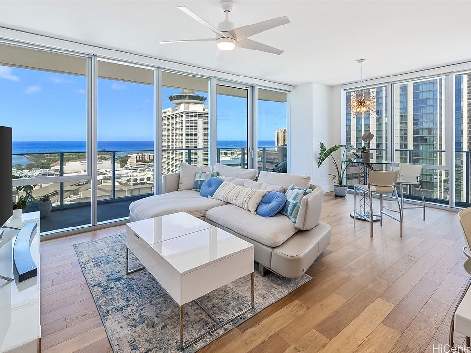 This highly desirable corner unit offers 270-degrees of expansive ocean, city, mountain, Magic Island and harbor views and is the largest 2-bed, 2-bath floor plan in the building. Floor-to-ceiling windows in every room with built-in motorized roller shades, complemented by a split AC system. The kitchen boasts contemporary glossy white finished cabinets, quartz countertops, and high-end appliances such as Sub-Zero, Bosch, and Wolf and a side-by-side washer/dryer laundry room off the kitchen. The primary suite offers privacy, a walk-in closet, and deep soaking tub with ocean views. Two full-sized covered side-by-side parking stalls. This pet-friendly home allows two pets and includes convenient built-in pet food trays in the kitchen. Building amenities include a swimming pool, fitness center, spa, BBQ cabanas, and a club lounge with a kitchen. Residents can also enjoy a movie theater, four guest suites, a dog park, EV charging stations, and the peace of mind provided by a 24-hour secured building. Located in the heart of Honolulu within close proximity to Ala Moana Beach and Park, Ala Moana Center Mall, Target, Walmart, Sam's Club, Don Quijote, and many restaurants.