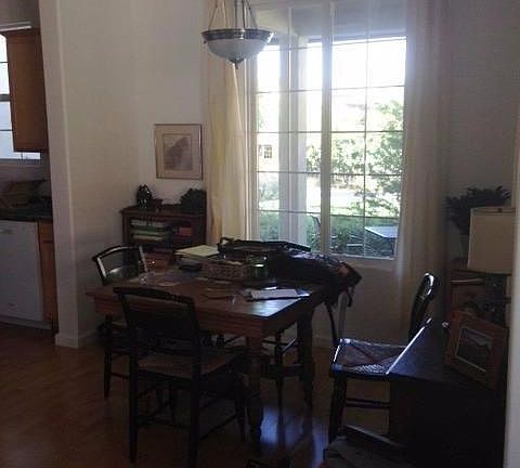 Rarely available one-bedroom condo. Clean, bright, beautiful end unit with lots of light, front and back patios, indoor laundry. This home has newer carpet and wood floors. Open floor plan with 9' ceilings, with a view of the pool Milgard windows and quality construction. The complex features a large common building with professional style kitchen, fireplace, media room, wood shop, and an elevator to the underground parking garage. This unique complex includes a 10 acre grove of old-growth-oak trees with walking trails, a dog park, an orchard, garden area, swimming pool, jacuzzi. In addition to the underground parking garage there are covered carports.